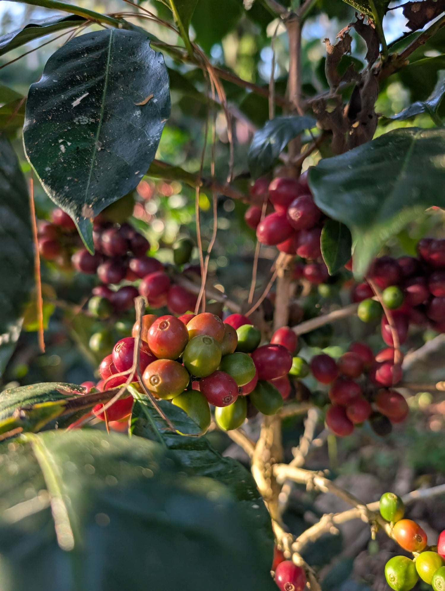 Caturra & Catuaí: Natürliche Mutationen von Bourbon. Höherer Ertrag, einfacher anzubauen. Sehr verbreitet in Lateinamerika — auch in unserem Peru.